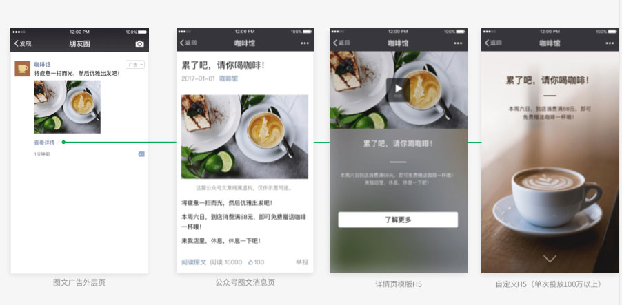 “文字链”引导用户访问“链接详情页”。 “链接详情页”主要用来详细描述广告创意,是进一步向感兴趣的用户传递诉求的重要部分。 “链接详情页”支持公众号图文消息、公众号详情页、应用下载落地页、模板H5页面或者自定义H5页面