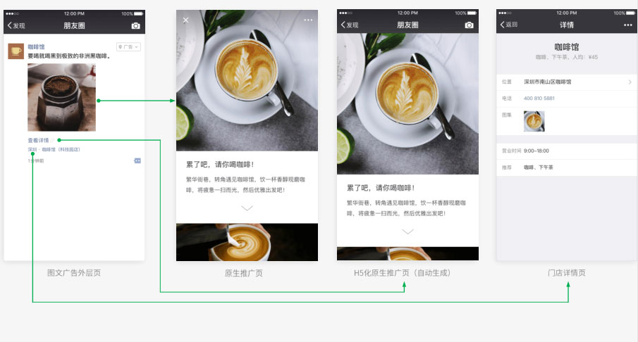 广告落地页可配置“查看详情”、 “领取优惠”或“预约活动”,点击后跳转H5详情模板页(支持收集信息或品牌推广)、公众号文章;点击门店标识,跳转门店详情页