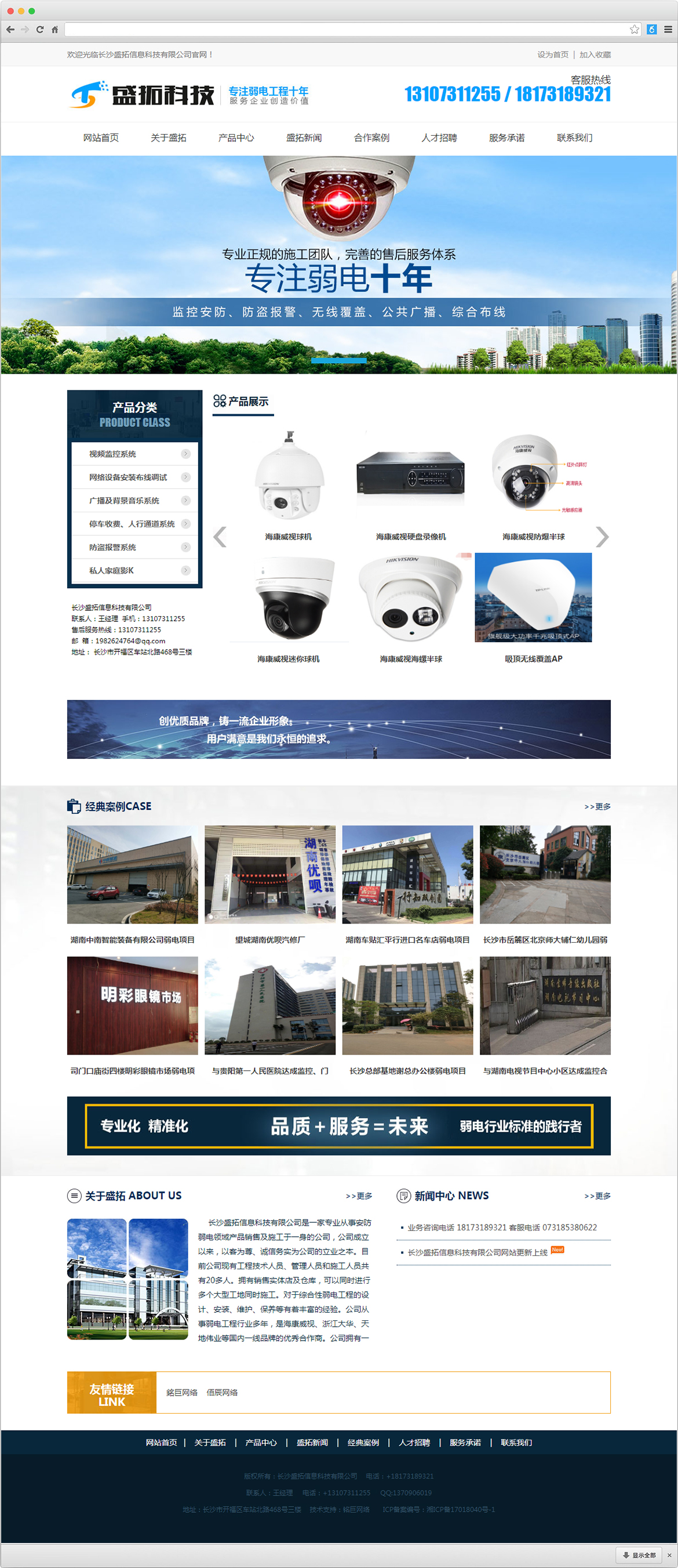 长沙盛拓信息科技有限公司是一家专业从事安防弱电领域产品销售及施工于一身的公司,公司成立以来,以客为尊、诚信务实为公司的立业之本。目前公司现有工程技术人员、管理人员和施工人员共有20多人。拥有销售实体店及仓库,可以同时进行多个大型工地同时施工。对于综合性弱电工程的设计、安装、维护、保养等有着丰富的经验。公司从事弱电工程行业多年,是海康威视、浙江大华、天地伟业等国内一线品牌的优秀合作商。公司拥有一支强大的设计、施工、技术团队,能承接各类安防监控、楼宇对讲、公共广播、门禁一卡通、防盗报警、智能停车场、多媒体会议系统等弱电工程。