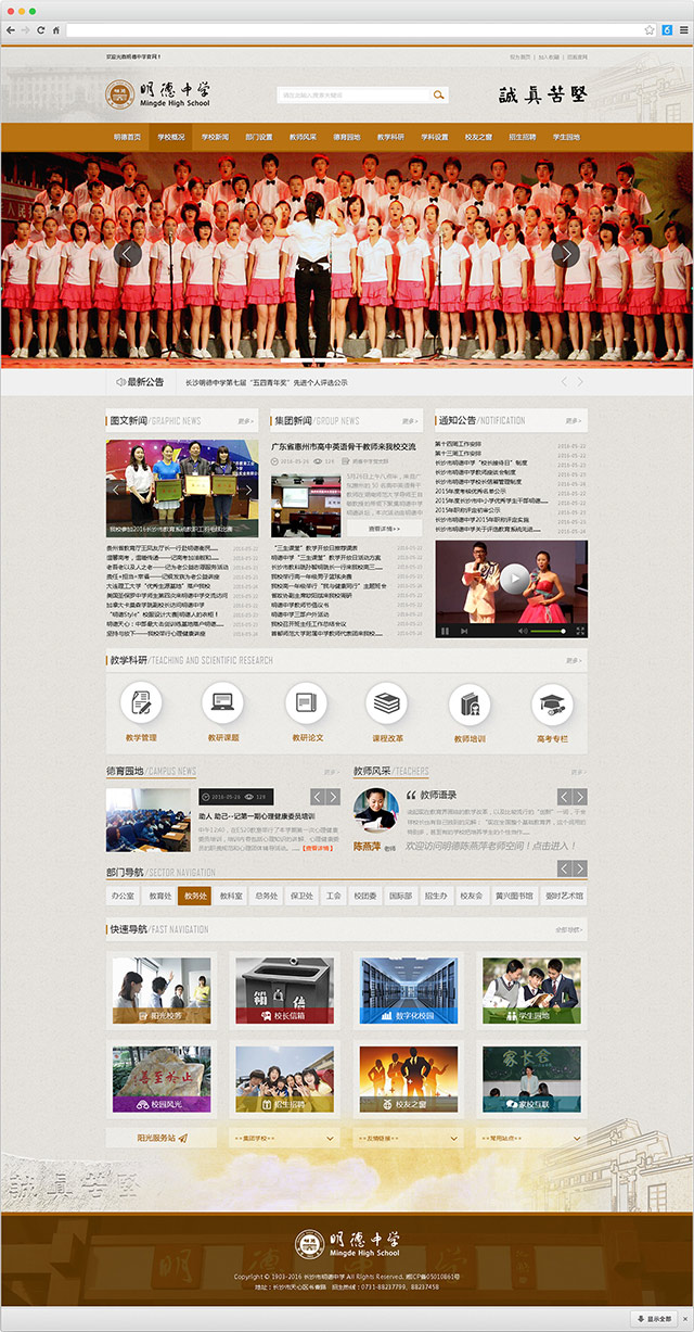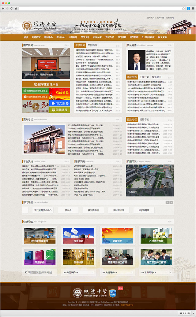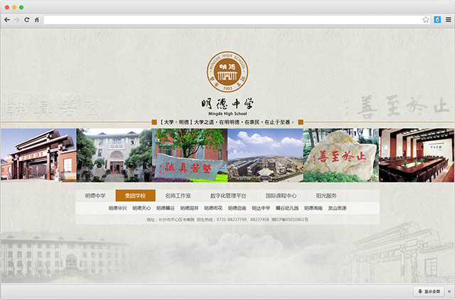 湖南省长沙市明德中学由中国近代著名教育家胡元倓先生创办于1903年,是湖南省最早的新式中学堂。解放后,明德中学一直是湖南省重点中学,2004年被评为湖南省首批示范性高级中学,办学成绩位居全省前列,现已发展成为湖南省最大的教育集团之一。学校本部位于长沙市天心区书香路,占地近10万平方米,总建筑面积86492平方米,在校高中学生近4000人,在职教师380余人。 114载岁月峥嵘,桃李天下。学校以“坚苦真诚”为校训,倡导“磨血育人“的办学精神,形成了五大文化符号:“辛亥革命策源地”“院士摇篮”“泰安球王”“北有南开,南有明德”“湖湘气韵,半出明德”。 1904年,黄兴、陈天华等明德师生创立“华兴会”,并以明德学堂为活动基地,故称“辛亥革命策源地”;1919年,毛泽东在《湘江评论》追述并赞誉“时务虽倒,而明德方兴”;1932年,蒋介石视察明德后题赠“止于至善”;1933年,明德位列“全国十佳模范中学”榜首;1934年,天津《大公报》载文称“明德与南开不啻南北并立之两大学府”,“北有南开,南有明德”之美誉播于大江南北;明德中学创办至今,培养了9万多名学生,英才辈出,政治家、军事家、科学家、艺术家等灿若群星,黄兴、任弼时、周小舟等政治家,周谷城、金岳霖等文化大师,丁夏畦、俞大光、肖纪美、刘经南、艾国祥等著名科学家,欧阳予倩、苏曼殊、吴祖光等著名艺术家,迄今为止从明德走出的院士达十七位之多,故称“院士摇篮”;发轫于长沙通泰街泰安里的明德男子篮球队从上世纪二十年代开始便长盛不衰,故称“泰安球王”;2012年,文化学者余秋雨来明德讲学后感慨并挥毫题赠“湖湘气韵,半出明德”。