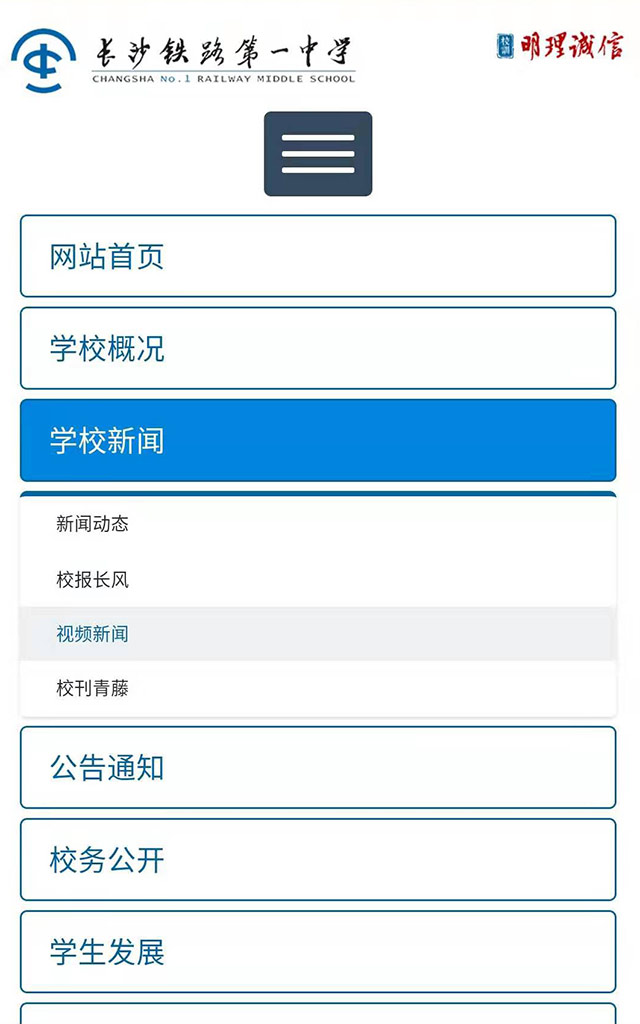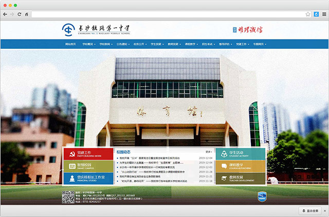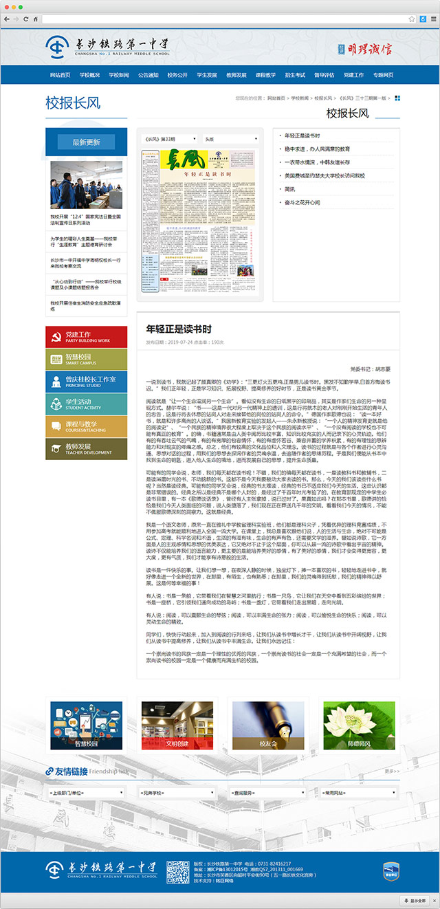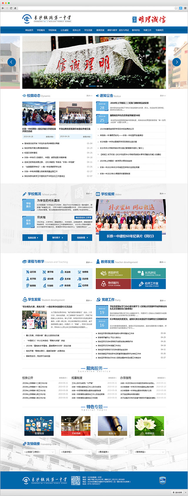 长铁一中首页设计遵循网页设计规范,有效内容处于安全宽度内;安全宽度区域内的内容设计排版采用通栏、二分栏、三分栏、四分栏相结合,色彩明晰,布局合理,重点突出;整体区块松紧结合,一张一弛,避免浏览者产生视觉疲劳。