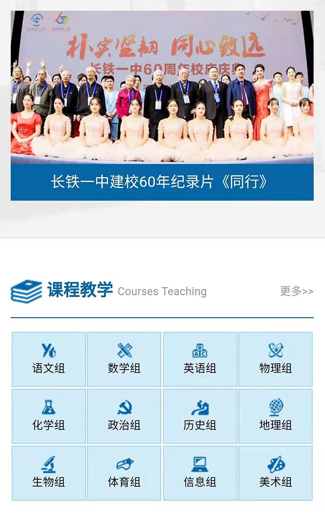 长铁一中品牌页采用单屏设计,色彩鲜明,内容简练,重点突出,既体现了学校在“互联网+教育”理念下的与时俱进,也突出了学校的办学特色。