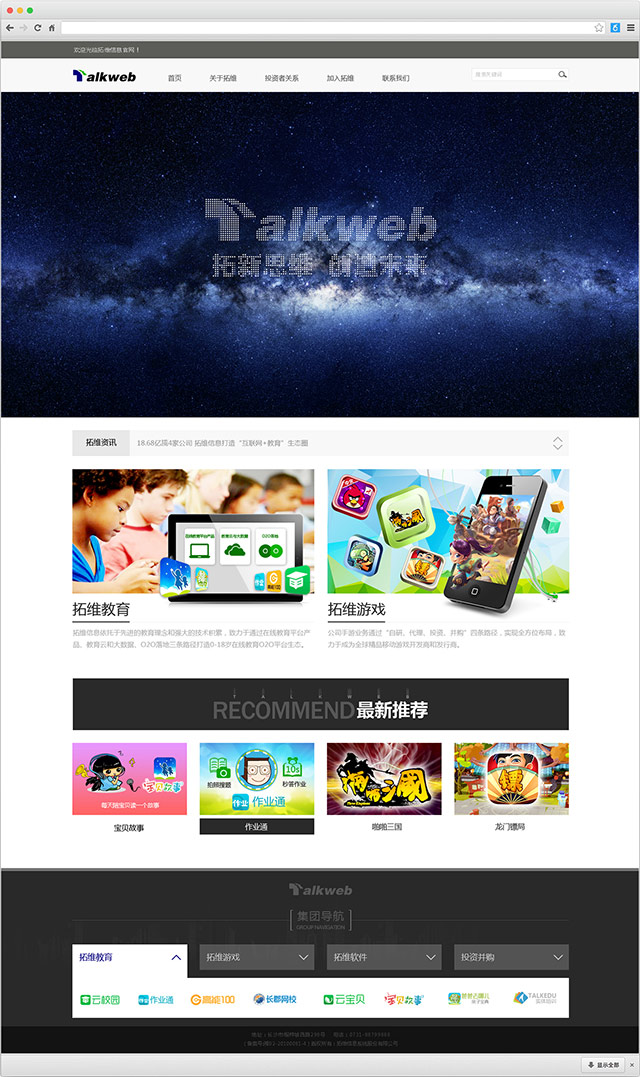 拓新思维,创造未来。拓维信息系统股份有限公司成立于1996年,成立之初,就立志做一家不断创新的科技企业。2008年,公司登陆深圳证券交易所,成功上市。历经多年发展,拓维信息现已成为拥有3000多名员工,以教育科技、软件服务、移动游戏为主营业务,在北京、上海、深圳、山东、香港、美国、日本等地设立了分支机构的移动互联网集团公司。